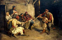 Srbijom su putovale profesionalne mačevalačke trupe koje su veštinu borbe mačem usavršile do najvećeg stepena. Izvodili su zamišljene borbe, odnosno, borbe sa zamišljenim neprijateljem, izvodili su tehniku napada i odbrane sa svih strana i sve je to praćeno uz ritam bubnjeva i gajdi. Vođa trupe je davao objašnjenja. Te trupe su bile sastavljene od 20 do 30 članova. Išli su od mesta do mesta, a uz put, pri susretu sa istom takvom trupom, započinjali su „borbu“ radi dokazovanja koja je škola mačevanja bolja.